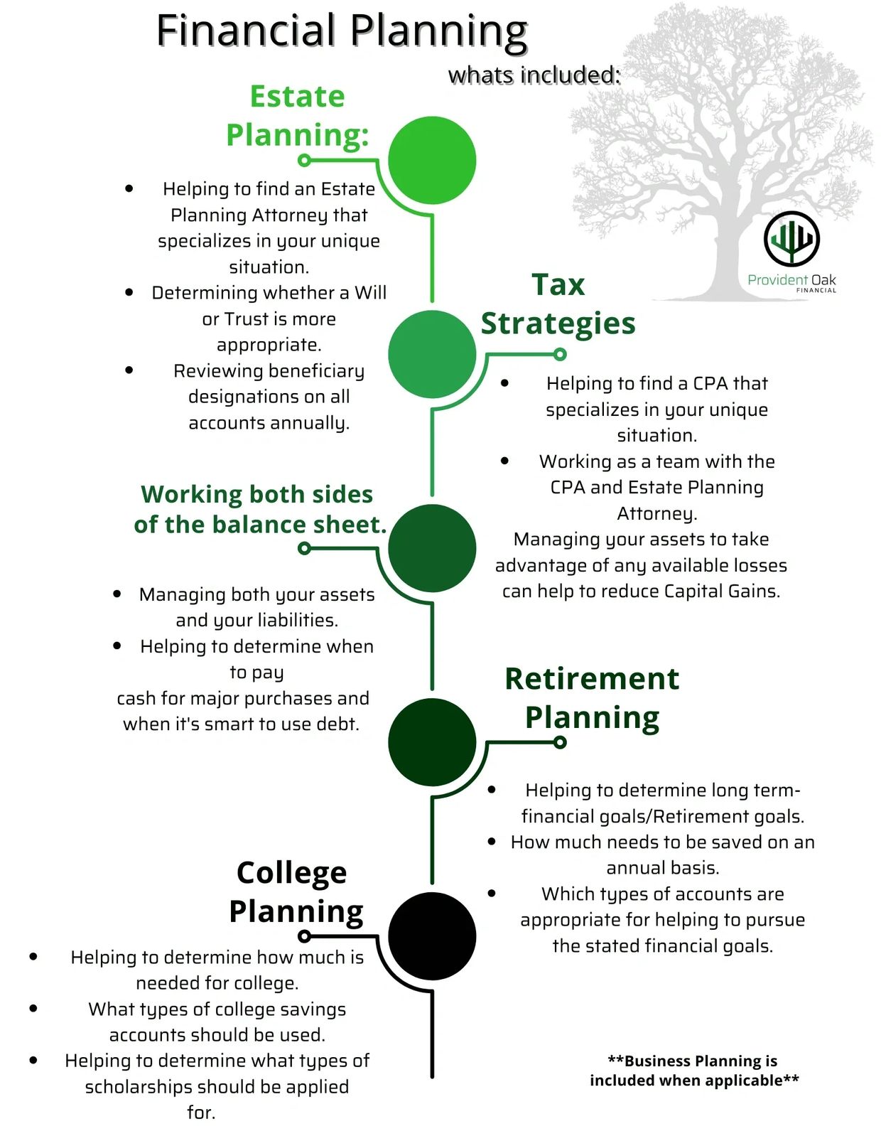 As a valued client of Provident Oak Financial, you can trust that we'll coordinate with your CPA, Estate Planning Attorney, and other professionals you're currently engaged with. Our priority is to ensure clear communication between all parties involved, including you—the decision maker—to keep everyone aligned and focused on your financial plan. If you don't have a team of professionals in place, we're happy to provide recommendations from our carefully curated network. Our primary goal is to support you in reaching your financial aspirations and guiding you from your current position to your desired future.